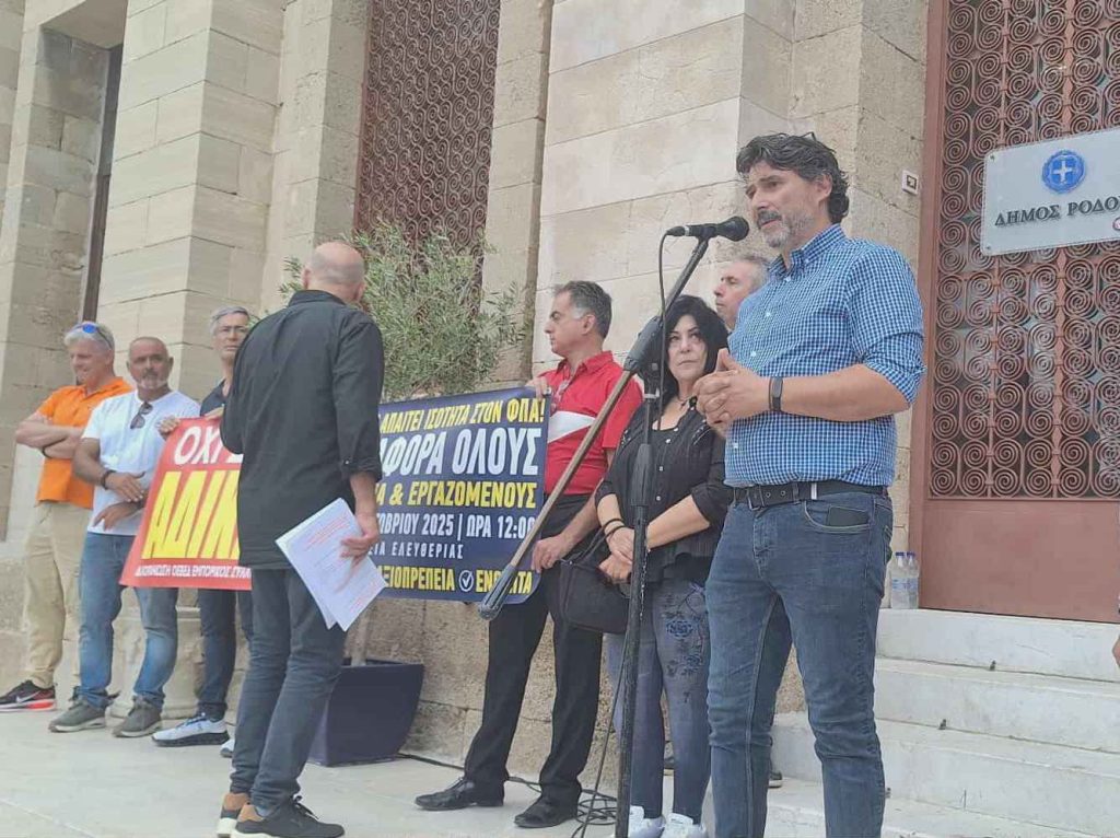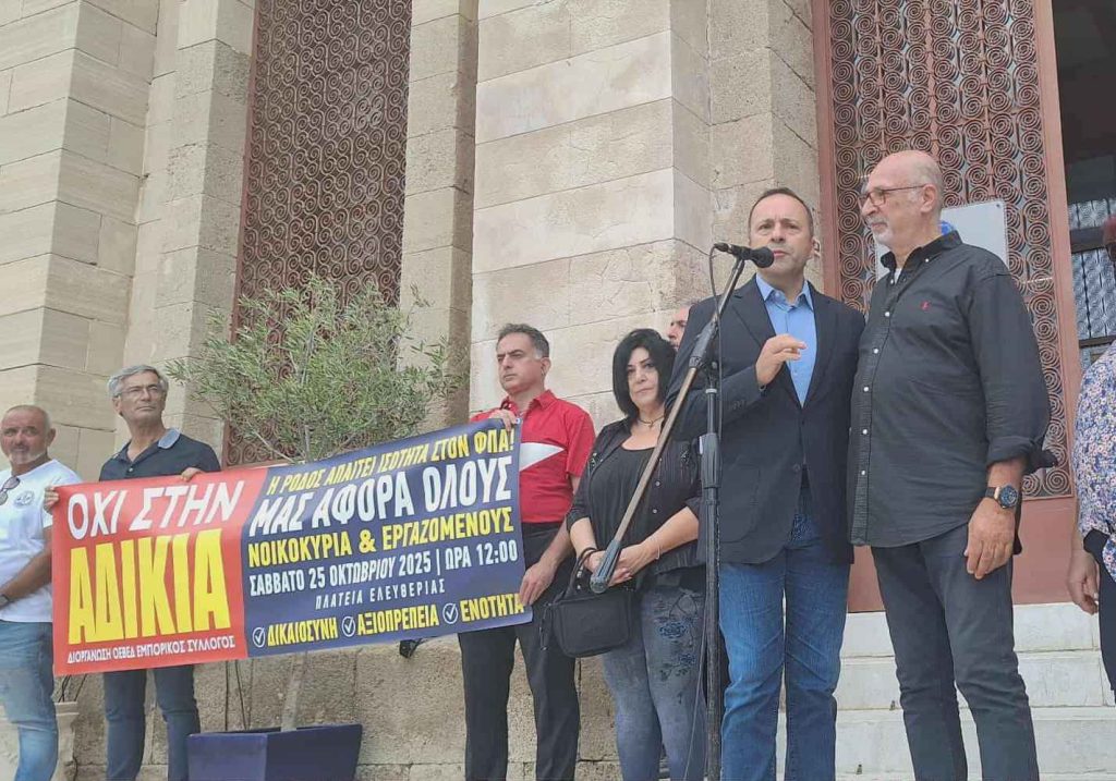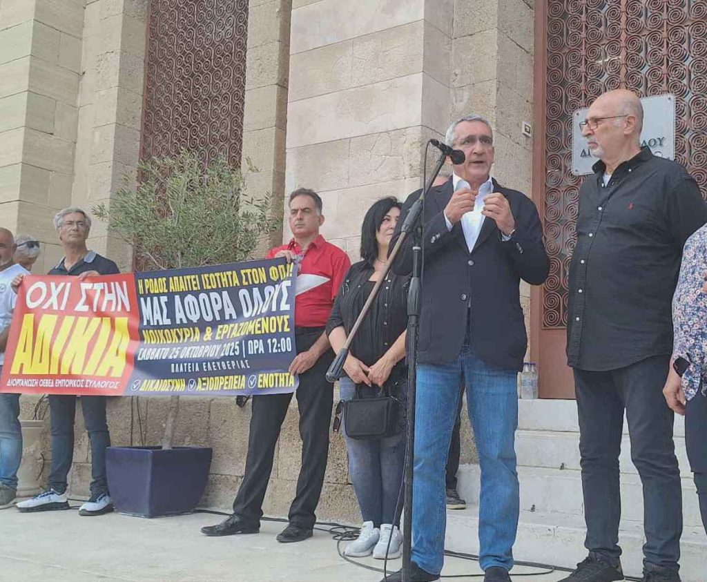 Την πρωτοβουλία για την συγκέντρωση ανέλαβαν η Ομοσπονδία Επαγγελματοβιοτεχνών – Εμπόρων Δωδ/σου και ο Εμπορικός Σύλλογος Ρόδου, με κύριο σύνθημα «Όχι στην αδικία – Η Ρόδος απαιτεί ισότητα στον ΦΠΑ».