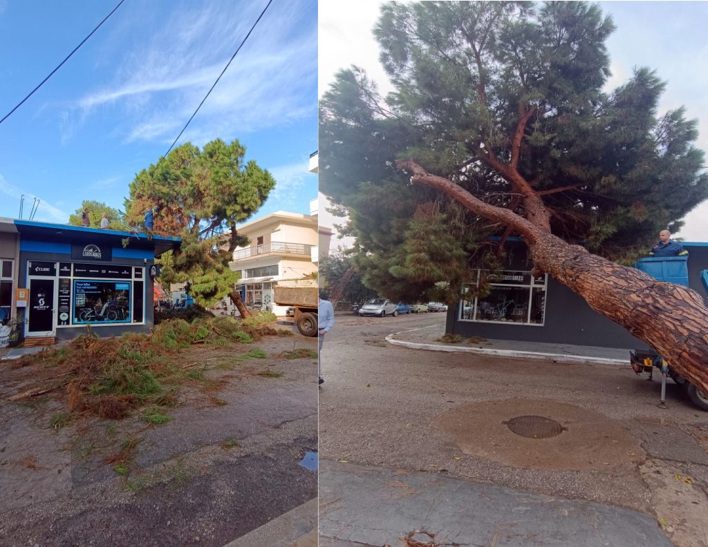 ‘Ετσι μετά τη χθεσινή έντονη και διαρκή νεροποντή που έπληξε το νησί, το δέντρο έγειρε προς την πλευρά της επιχείρησης χωρίς ευτυχώς να έχουμε θύματα, κάτι για το οποίο οι περίοικοι ήταν ανήσυχοι αν αυτό συνέβαινε άλλη στιγμή . Οι ρίζες δε του πεύκου αυτού, σήκωσαν το δάπεδο παρακείμενης επιχείρησης που πωλεί πανιά για ιστιοφόρα.