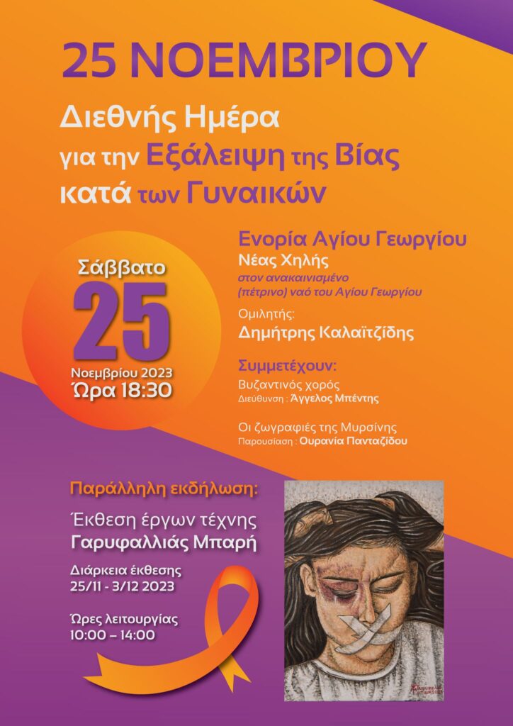 Η εκδήλωση πραγματοποιείται με αφορμή την  Παγκόσμια Ημέρα για την Εξάλειψη της Βίας κατά των Γυναικών και θα περιλαμβάνει ομιλίες , βυζαντινό χορό και έκθεση έργων τέχνης.