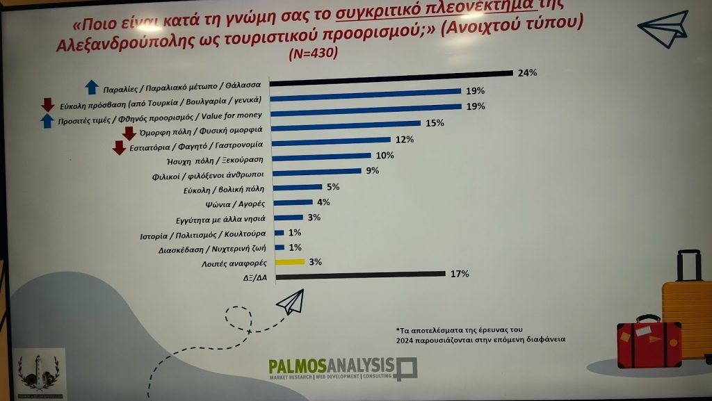 Συνεχίζει να διατηρεί την τουριστική δυναμική της η Αλεξανδρούπολη σύμφωνα με την τελευταία έρευνα επισκεπτών. Σε ειδική εκδήλωση που πραγματοποιήθηκε τη Δευτέρα 17/11, ο Δήμος παρουσίασε τα αποτελέσματα της έρευνας «Τουριστικό Βαρόμετρο 2025», που υλοποιήθηκε από την Palmos Analysis το διάστημα Αυγούστου–Οκτωβρίου 2025, σε συνολικά 492 επισκέπτες άνω των 17 ετών, αποτυπώθηκε η εικόνα των επισκεπτών, η συμπεριφορά τους και οι τάσεις του τουρισμού στην περιοχή. Αλλαγές τουριστικών προτεραιοτήτων και δαπανών, καταδεικνύει η έρευνα όπως και αδυναμίες στις υποδομές που χρήζουν άμεσης βελτίωσης, όπως Τελωνείο και θέσεις στάθμευσης