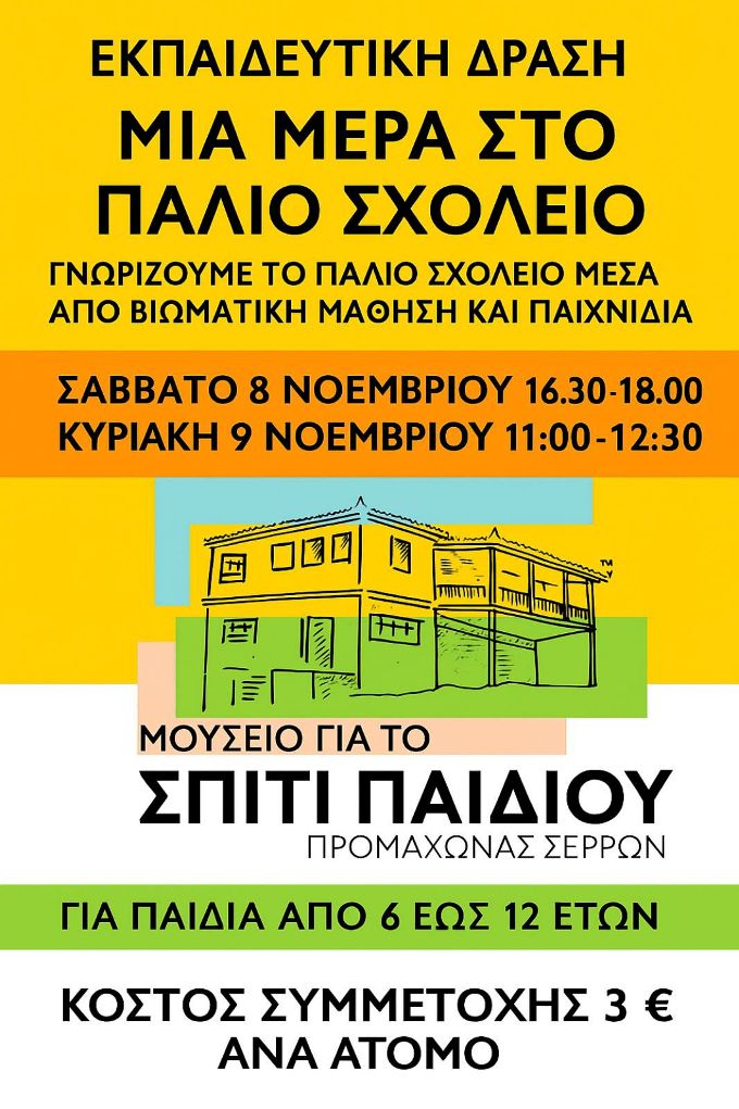 Ξύλινα θρανία, μαυροπίνακας, σχολικές ποδιές, ο παπα-δάσκαλος, η βέργα, το κονδύλι, ξύλινα παιχνίδια άλλης εποχής θα μεταφέρουν τα παιδιά σ’ ένα ταξίδι στο χρόνο και στην εκπαίδευση μια άλλης εποχής. Πρόκειται για βιωματική εμπειρία γνωριμίας του παλιού σχολείου για παιδιά από 6 έως 12 ετών. Η δράση θα πραγματοποιηθεί το Σάββατο 8 Νοεμβρίου στις 16.30 και την Κυριακή 9 Νοεμβρίου στις 11 π.μ.