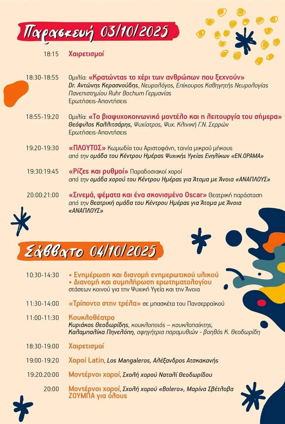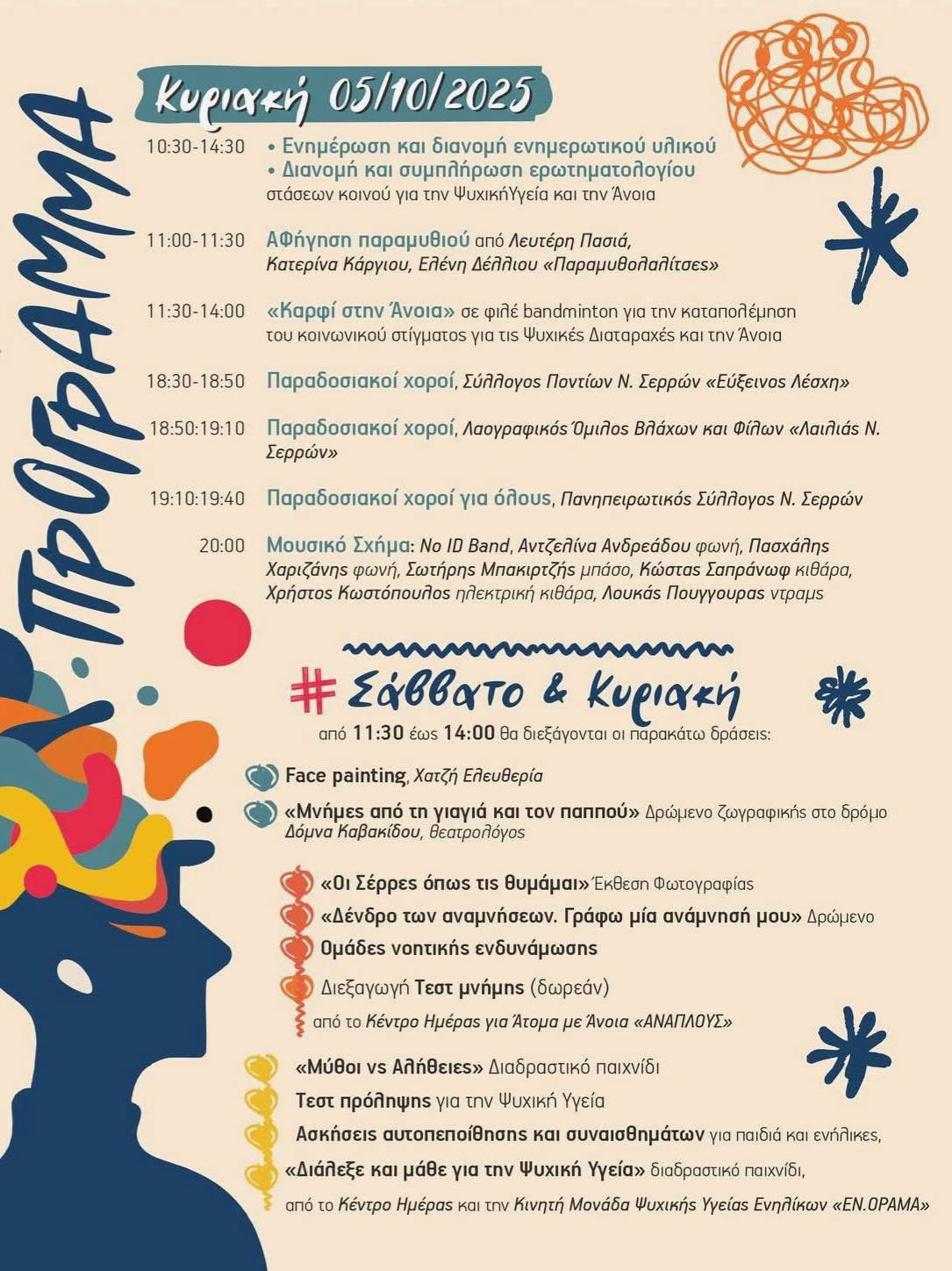 Τριήμερο ενημέρωσης, ευαισθητοποίησης, άθλησης και ψυχαγωγίας περιλαμβάνει το 17ο Φεστιβάλ για την Ψυχική Υγεία και την Άνοια, που διοργανώνει 3- 5 Οκτωβρίου , ο Σύλλογος Οικογενειών/Φροντιστών και Φίλων για την Ψυχική Υγεία, Νόσο Alzheimer και Συγγενείς Διαταραχές (Σ.Ο.Φ.Ψ.Υ. )Ν. Σερρών. Πρόκειται για μία πολυδιάστατη εκδήλωση που προσφέρει υποστήριξη και έμπνευση σε όσους αντιμετωπίζουν προκλήσεις που σχετίζονται με την ψυχική υγεία και την άνοια.