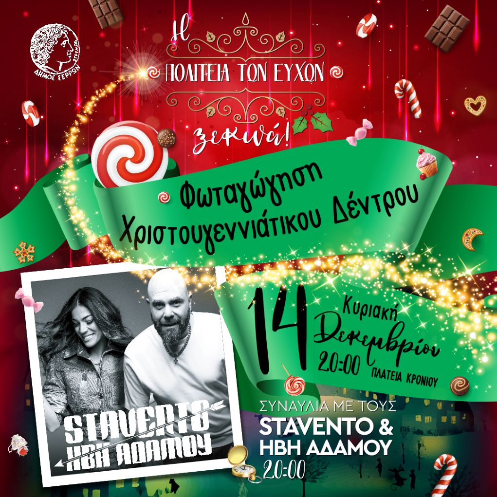 Με τη λαμπερή φωταγώγηση του Χριστουγεννιάτικου δέντρου θα γίνει η επίσημη έναρξη της «Πολιτείας των Ευχών» το απόγευμα της Κυριακής 14 Δεκεμβρίου 2025 στην πλατεία Κρονίου χαρίζοντας φως μουσική, χαμόγελα, δημιουργία και γιορτινή μαγεία. Τη μεγάλη γιορτή θα πλαισιώσει η συναυλία των Stavento και της Ήβης Αδάμου όπου αναμένεται να χαρίσουν στο κοινό μία αξέχαστη μουσική βραδιά.