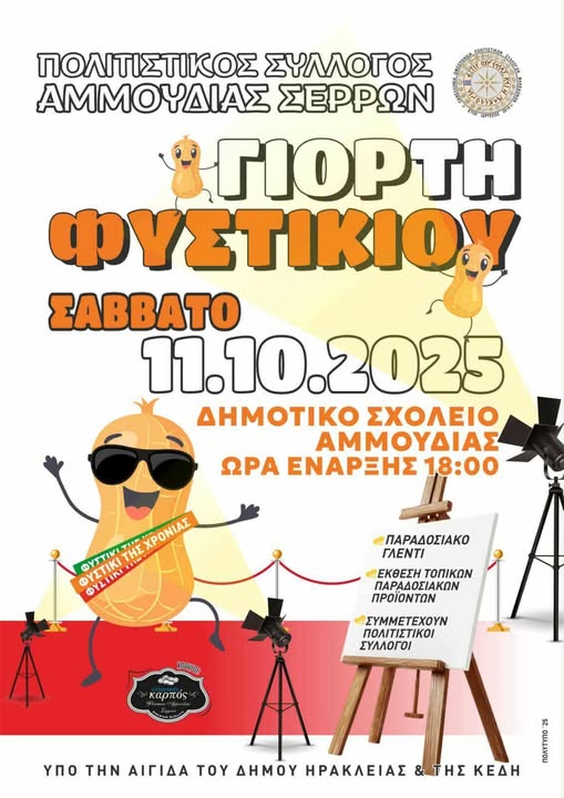 Για μια ακόμη χρονιά, ο Πολιτιστικός Σύλλογος Αμμουδιάς Σερρών, διοργανώνει τη Γιορτή φυστικιού, στην Αμμουδιά. Η γιορτή θα πραγματοποιηθεί το Σάββατο 11 Οκτωβρίου, στις 6 το απόγευμα, στο Δημοτικό Σχολείο Αμμουδιάς και τελεί υπό την αιγίδα του Δήμου Ηράκλειας και της ΚΕΔΗ.