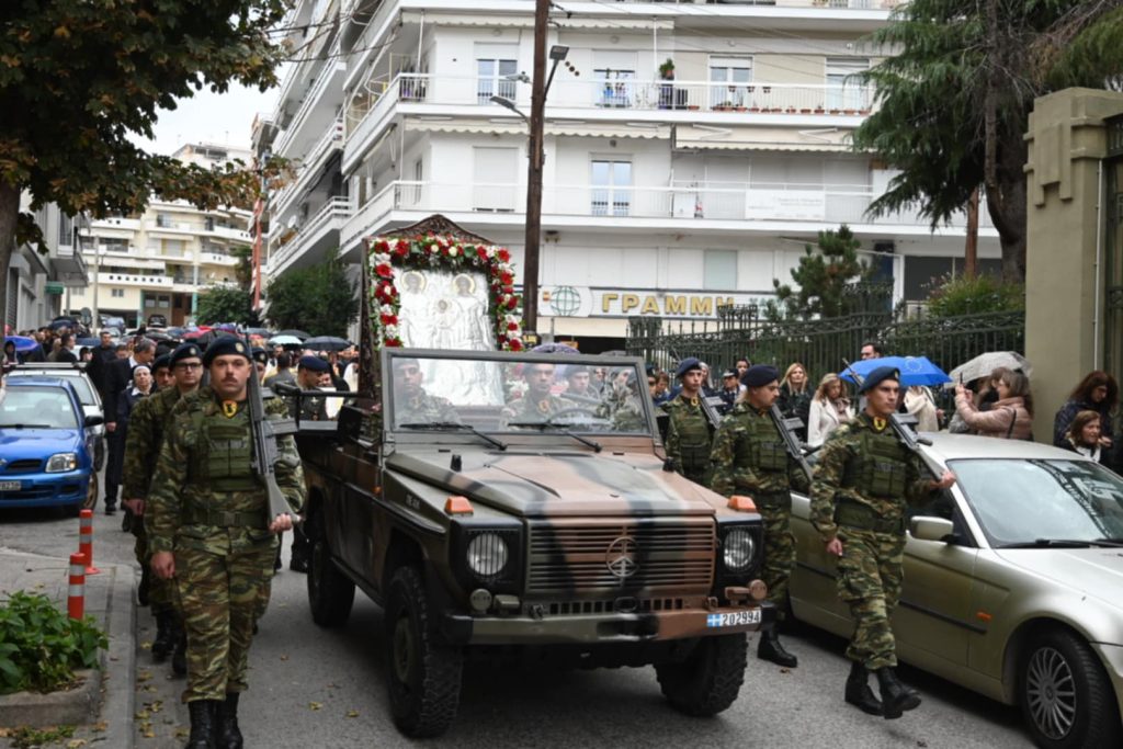 Η λιτανεία της ιερής εικόνας αλλά και του θαυματοβρύτου λειψάνου του οσίου Παταπίου τελέστηκε υπό βροχή, με την συνοδεία στρατιωτικού αγήματος, τμημάτων πολιτιστικών συλλόγων και σημαιοφόρων μαθητών.
