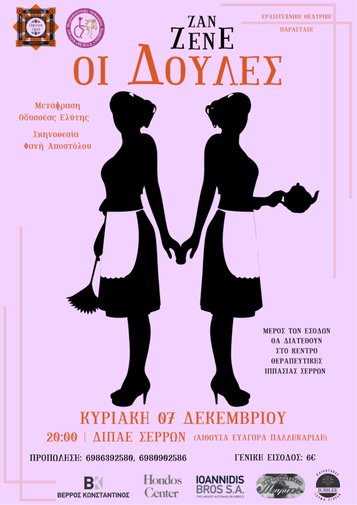 Τη ερασιτεχνική θεατρική παράσταση «Οι Δούλες» του Ζαν Ζενέ, παρουσιάζει ο Πολιτιστικός Σύλλογος «Ακουεόρα», ένα εμβληματικό έργο του σύγχρονου θεάτρου που διερευνά τη δύναμη, την υποταγή και τα σκοτεινά όρια της ανθρώπινης ταυτότητας.