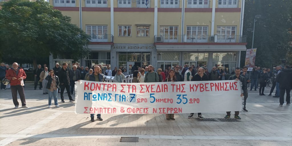 Με συνθήματα κατά του νέου εργασιακού νομοσχεδίου του υπουργείου Εργασίας εργαζόμενοι από σωματεία και φορείς της Π.Ε. Σερρών πραγματοποίησαν το πρωί συγκέντρωση στην πλατεία Ελευθερίας και στη συνέχεια έκαναν πορεία στο κέντρο της πόλης.