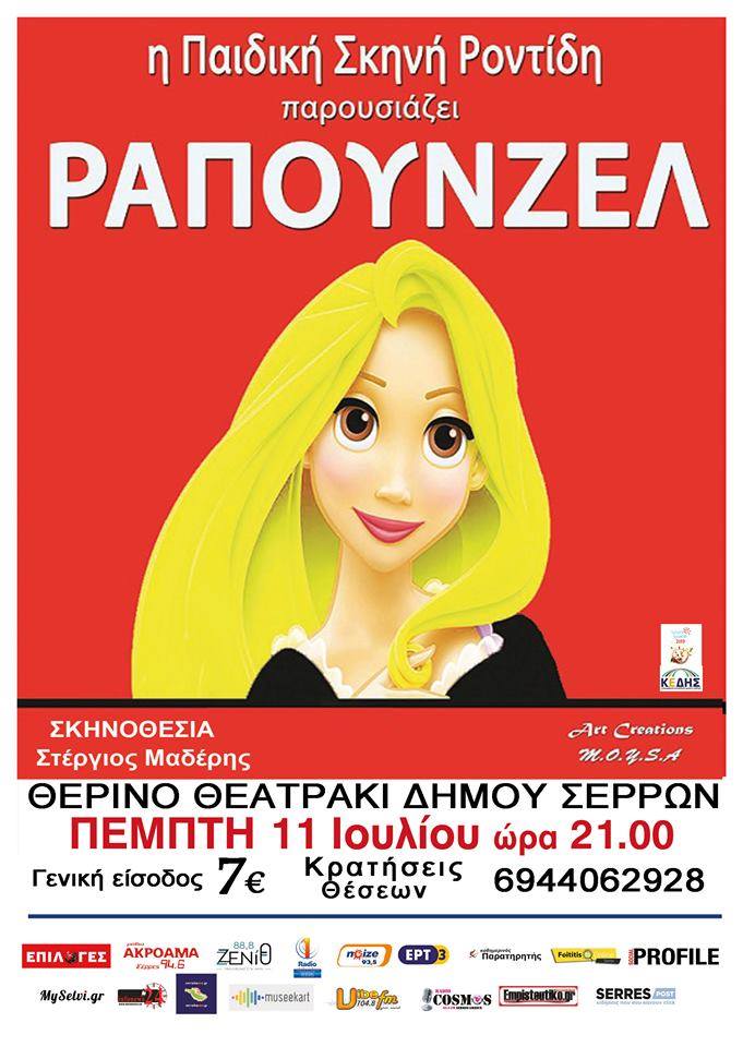 Το θεατρικό έργο « ΡΑΠΟΥΝΖΕΛ» παρουσιάζει σήμερα, στις 9 μ.μ., στο Θερινό Θεατράκι του Δήμου Σερρών η Παιδική Σκηνή Ροντίδη. Η παράσταση εντάσσεται στο πρόγραμμα των εκδηλώσεων «Πολιτιστικό Καλοκαίρι 2019» που διοργανώνει η ΚΕΔΗΣ.