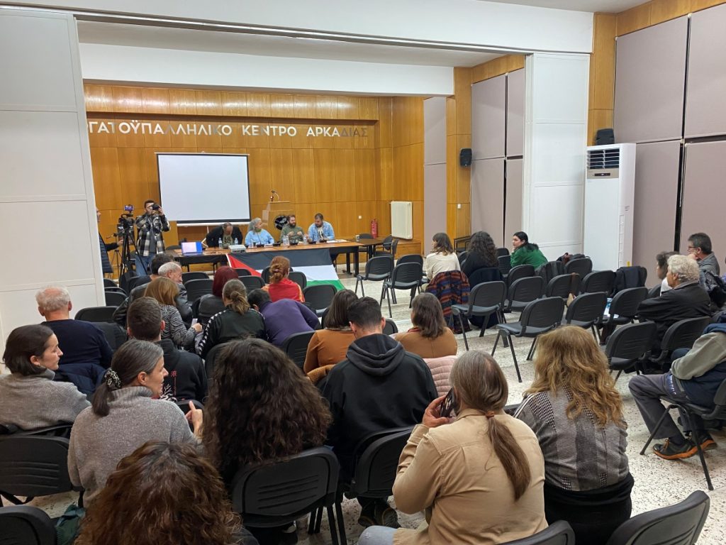 Η πρώτη εκδήλωση έγινε στο Εργατικό Κέντρο Αρκαδίας, στην Τρίπολη. Θέμα της εκδήλωσης το Παλαιστινιακό ζήτημα. Σε μία κατάμεστη αίθουσα, έγιναν ομιλίες και συζητήσεις για όλο αυτό το πρόβλημα και υπήρξε ενημέρωση για το Παλαιστινιακό θέμα. Τίτλος της εκδήλωσης ήταν ” Με την Παλαιστίνη έως τη λευτεριά ”. Στο χώρο, λειτούργησε και έκθεση Παλαιστινιακού βιβλίου. Στην εκδήλωση, μίλησαν οι Νασίμ Αλάτρας, Ναουζάτ Χαντίντ, Παντελής Βλάχας. Ακούστηκαν διάφορα πράγματα, όπως η αντίσταση, η αλληλεγγύη, η κατοχή, οι πολεμικές συγκρούσεις, ο αγώνας των Παλαιστινίων, το σχέδιο Τραμπ, η παύση των εχθροπραξιών, το ιστορικό και το μέλλον του Παλαιστινιακού λαού.