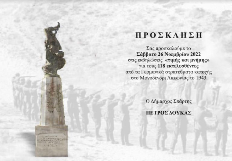 Εκδήλωση τιμής και μνήμης για τους 118 εκτελεσμένους από τα Γερμανικά στρατεύματα Κατοχής στο Μονοδένδρι Λακωνίας το 1943, θα πραγματοποιηθεί το Σάββατο, 26 Νοεμβρίου 2022.