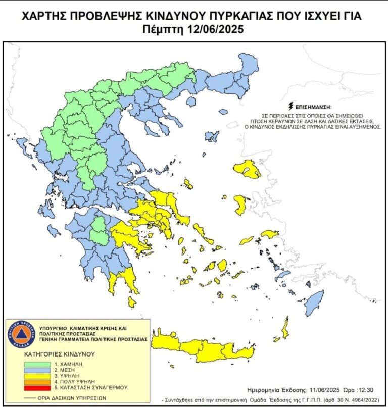 Iδιαίτερη προσοχή θα χρειαστεί και την Πέμπτη, 12 Ιουνίου 2025, όσον αφορά την επικινδυνότητα για την εκδήλωση πυρκαγιάς.