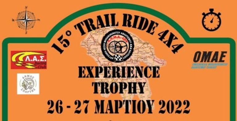 Η Α.Λ.Μ.Α. 4Χ4 ΝΑΥΠΛΙΟΥ σε συνεργασία με την Λ.Α. Σπάρτης και την υποστήριξη του Αθλητικού Οργανισμού του Δήμου Σπάρτης διοργανώνουν στις 26 & 27/3/2022 τον 2ημερο αγώνα του Πανελληνίου Επάθλου το «15ο TRAIL RIDE 4X4 & EXPERIENCE TROPHY».