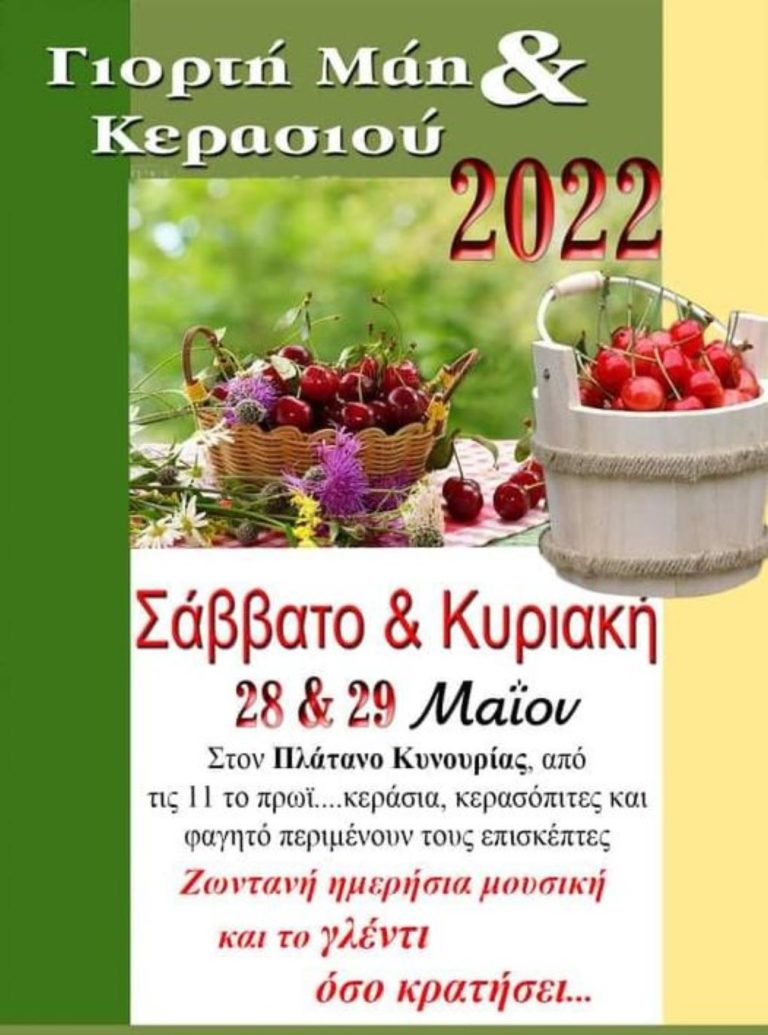 Το Σαββατοκύριακο 28 και 29 Μαΐου θα πραγματοποιηθεί η εορτή του Μάη και του κερασιού, στον γραφικό και γεμάτο νερά, Πλάτανο Κυνουρίας. Πρόκειται για διήμερη δράση που συγκεντρώνει αρκετό κόσμο, με βασικό θέμα το κεράσι και τα όσα γλυκά γίνονται απ’ αυτό.