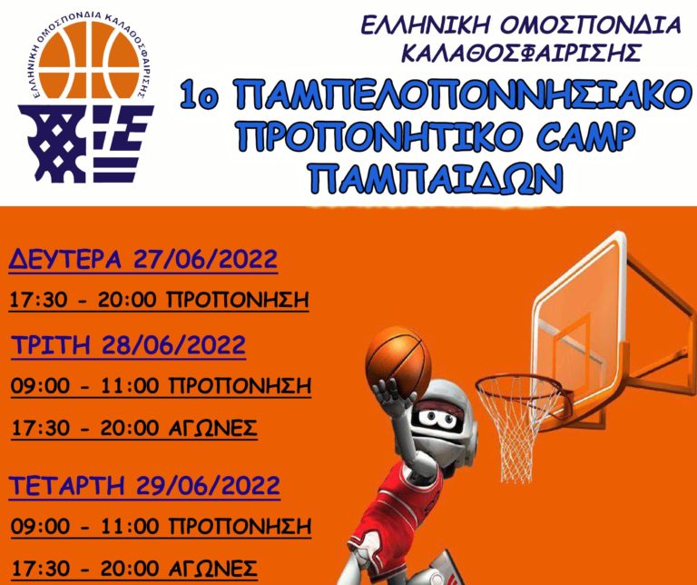 Στα πλαίσια του Αναπτυξιακού Προγράμματος της Ελληνικής Ομοσπονδίας Καλαθοσφαίρισης (Ε.Ο.Κ.), σε συνεργασία με τον Δήμο Μονεμβασιάς και την Ε.ΚΑ.Σ.ΚΕ.ΝΟ.Π., θα πραγματοποιηθεί στο κλειστό γυμναστήριο των Μολάων, το 1ο Παμπελοποννησιακό προπονητικό camp παμπαίδων, από σήμερα Δευτέρα 27 έως την Πέμπτη 30 Ιουνίου 2022.