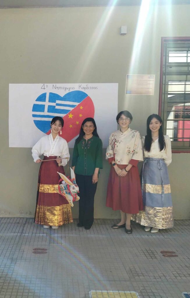 Οι καθηγήτριες του Ινστιτούτου, Καθ. Wang Xiaohong, Καθ. Chen Yusong, κυρία Huang Yuyan και η κυρία Qu Jiaying ντυμένες με παραδοσιακές στολές της δυναστείας των Μινγκ, με πολύ χαμόγελο και ευρηματικότητα, έκαναν μια ευχάριστη και δια δραστική παρουσίαση στους μαθητές και στις μαθήτριες του νηπιαγωγείου αλλά και αμέσως μετά των Α΄, Β΄, Γ΄και Δ΄ τάξεων του δημοτικού σχολείου.