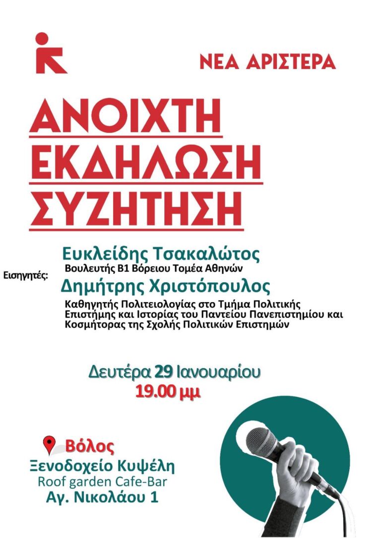 Τέλος, στις 19:00 στο στο roof garden του ξενοδοχείου Κυψέλη (Αγ. Νικολάου 1) θα πραγματοποιηθεί η πρώτη ανοιχτή εκδήλωση της Νέας Αριστεράς Μαγνησίας παρουσία των Ε. Τσακαλώτου και Δ. Χριστόπουλου.