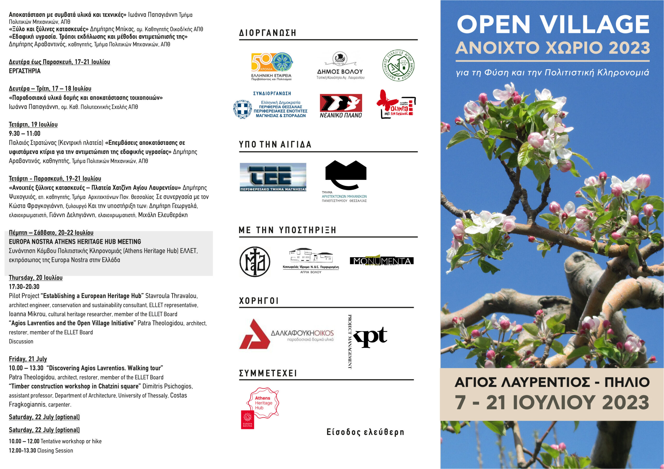 Επιπλέον, φέτος το «Ανοιχτό Χωριό» περιλαμβάνει στις εκδηλώσεις του τη δεύτερη συνάντηση του Κόμβου Πολιτιστικής Κληρονομιάς ΝΑ Ευρώπης της Europa Nostra, (Athens Heritage Hub) που εκπροσωπεί η ΕΛΛΗΝΙΚΗ ΕΤΑΙΡΕΙΑ Περιβάλλοντος και Πολιτισμού που θα πραγματοποιηθεί το διήμερο 20 και 21 Ιουλίου.