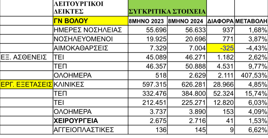 Η δραστηριότητα του Γενικού Νοσοκομείου Βόλου κατά το 8μηνο του 2024 είναι σαφέστατα αυξημένη, σχεδόν σε όλα τα επίπεδα σε σύγκριση με το αντίστοιχο 8μηνο του 2023, όπως προκύπτει από τα παρακάτω συγκριτικά στοιχεία.