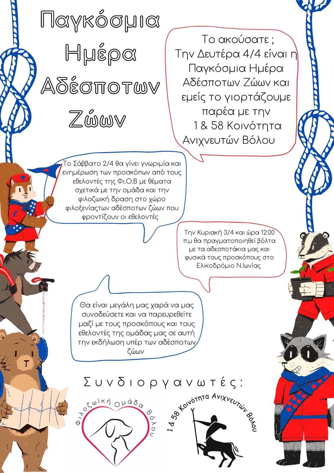 Στις 4 Απριλίου τιμάται η Παγκόσμια Ημέρα Αδέσποτων και η Φιλοζωική Ομάδα Βόλου διοργανώνει διήμερο δράσεων ευαισθητοποίησης των πολιτών. Ειδικότερα, οι εθελοντές της Φιλοζωικής, μαζί με το 1 & 58 Κοινότητα Ανιχνευτών Βόλου, συνδιοργανώνουν διήμερο δραστηριοτήτων με μότο: «Ανοίγουμε κλουβιά».