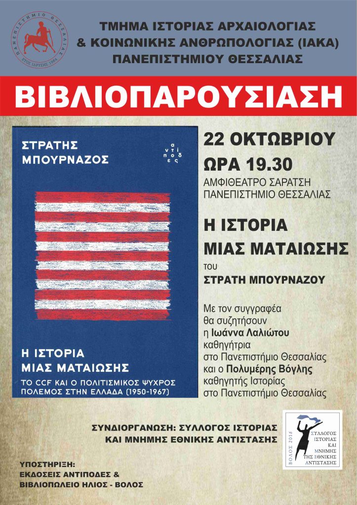 «Πώς ο Ψυχρός Πόλεμος επεκτάθηκε από τα πεδία των πολιτικών και στρατιωτικών συγκρούσεων στον χώρο των ιδεών και του πολιτισμού; Πώς η CIA αξιοποίησε τη λογοτεχνία, τις τέχνες και τα μέσα ενημέρωσης για να επηρεάσει την κοινή γνώμη στην Ευρώπη και στην Ελλάδα;» Αυτά τα ερωτήματα θα βρεθούν στο επίκεντρο της εκδήλωσης που συνδιοργανώνουν το Τμήμα Ιστορίας, Αρχαιολογίας και Κοινωνικής Ανθρωπολογίας (ΙΑΚΑ) του Πανεπιστημίου Θεσσαλίας και ο Σύλλογος Ιστορίας Μνήμης Εθνικής Αντίστασης (ΣΙΜΕΑ).