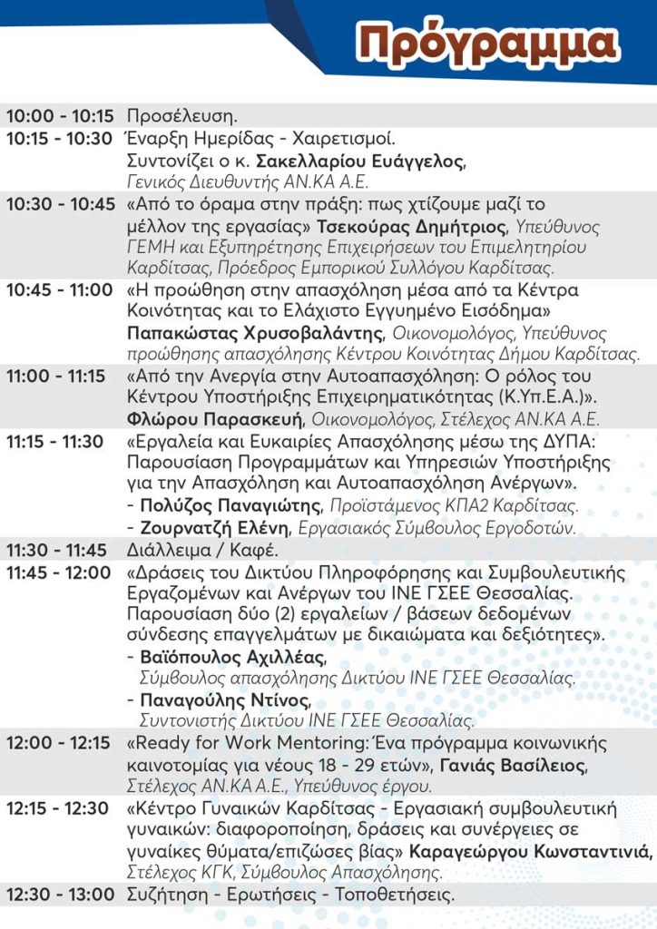 Η Αναπτυξιακή Καρδίτσας Αναπτυξιακή Ανώνυμη Εταιρεία Ο.Τ.Α. (Δομή Κ.Υπ.Ε.Α.) και το Κέντρο Κοινότητας με Παράρτημα Ρομά του Δήμου Καρδίτσας διοργανώνουν ενημερωτική ημερίδα με θέμα: «Χαρτογραφώντας το Μέλλον σου: Εργαλεία και Διαδρομές προς την Επαγγελματική Ανάπτυξη», η οποία θα πραγματοποιηθεί την Πέμπτη 6 Νοεμβρίου 2025, στις 10:00 π.μ., στην αίθουσα του Επιμελητηρίου Καρδίτσας (Ηρώων Πολυτεχνείου 3, 3ος όροφος).