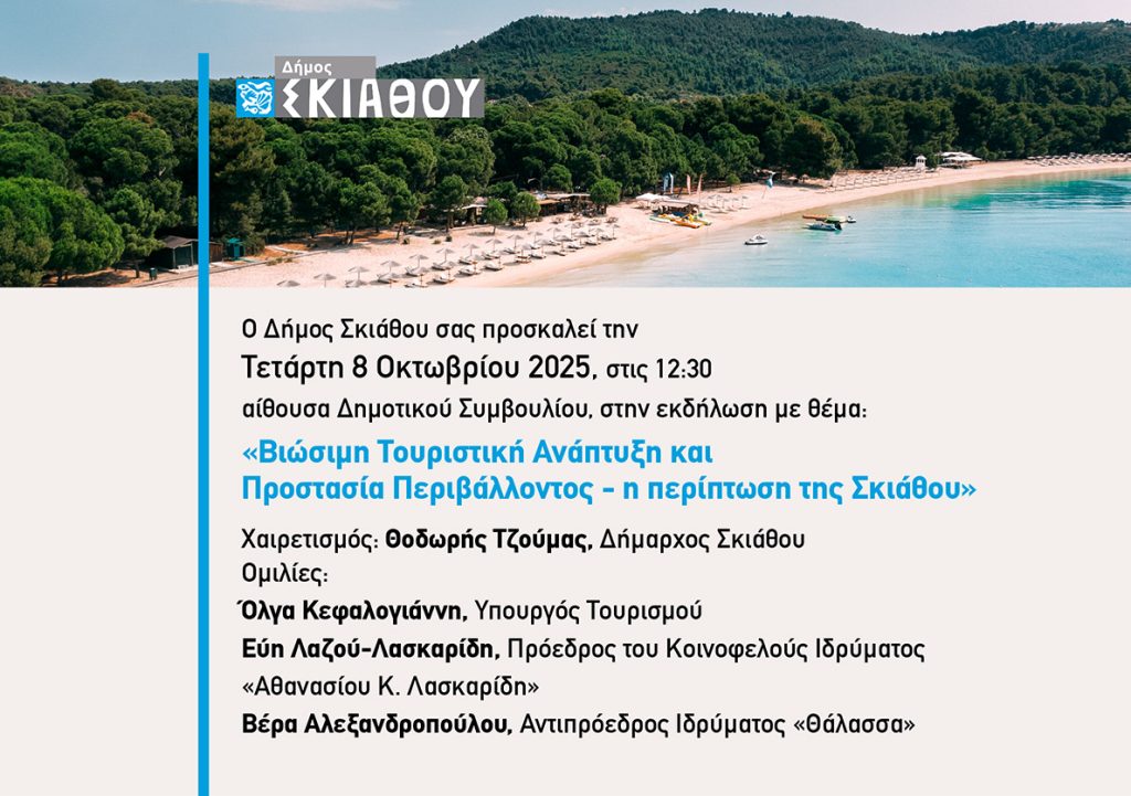 Ο Δήμος Σκιάθου διοργανώνει την Τετάρτη 8 Οκτωβρίου 2025, στις 12:30, στην αίθουσα του Δημοτικού Συμβουλίου, εκδήλωση με θέμα «Βιώσιμη Τουριστική Ανάπτυξη και Προστασία Περιβάλλοντος – η περίπτωση της Σκιάθου».