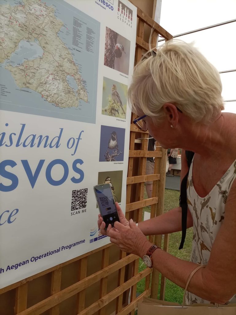 Στο περίπτερο της Λέσβου υποδέχονταν τους επισκέπτες και παρείχαν πληροφόρηση για την ορνιθοπανίδα και τις δυνατότητες ορνιθοπαρατήρησης η Δρ Ελένη Γαληνού, υπεύθυνη για την καταγραφή και προβολή ορνιθοπανίδας στο Μουσείο, και ο Στέλιος Ζαννέτος, Υπ. Διδάκτορας του Τμήματος Περιβάλλοντος Παν. Αιγαίου.