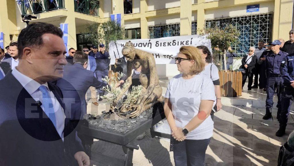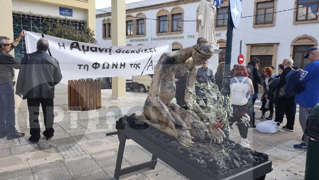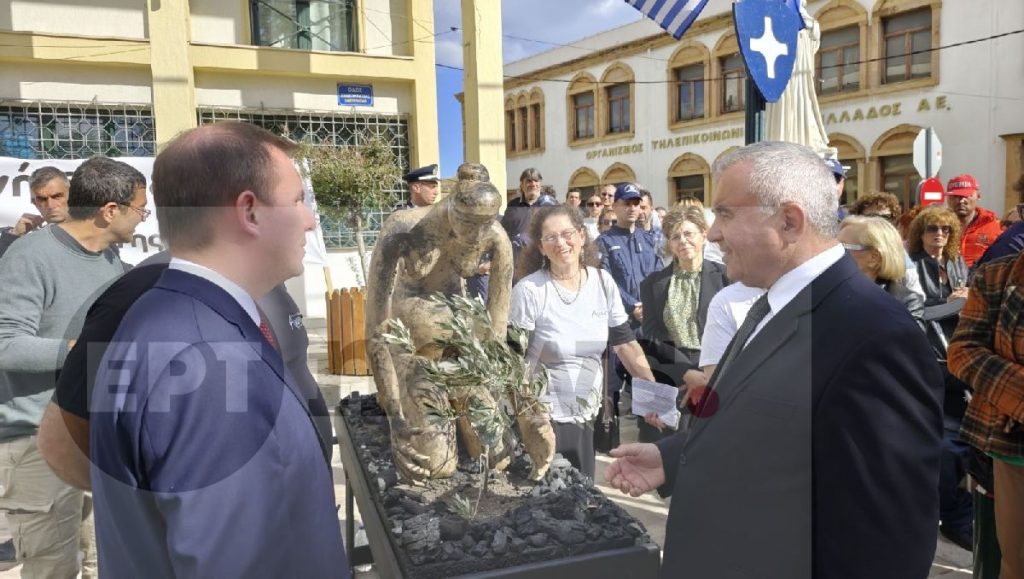Όμως οι κάτοικοι της Αμανής με τρόπο ειρηνικό και επιλέγοντας μια εικαστική παρέμβαση, (ένα γλυπτό του Γιάννη Κοντού, που δείχνει μια γυναίκα εγκυμονούσα να ακουμπά πάνω στα αποκαΐδια και με τα χέρια της να προστατεύει μια ελιά) έδειξαν από την αρχή ότι δεν είχαν σκοπό να δημιουργήσουν επεισόδια, τιμώντας έτσι και την ξεχωριστή αυτή ημέρα.