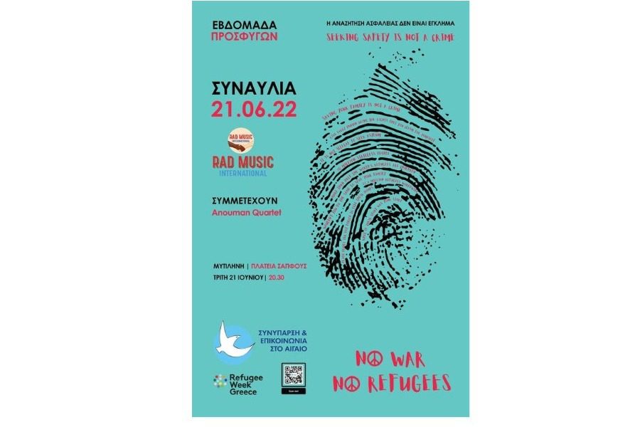 Συναυλία αφιερωμένη στην Εβδομάδα των Προσφύγων διοργανώνει η Κίνηση «Συνύπαρξη και Επικοινωνία στο Αιγαίο», την Τρίτη 21 Ιουνίου στις 8 και 30 το απόγευμα στην Πλατεία Σαπφούς.