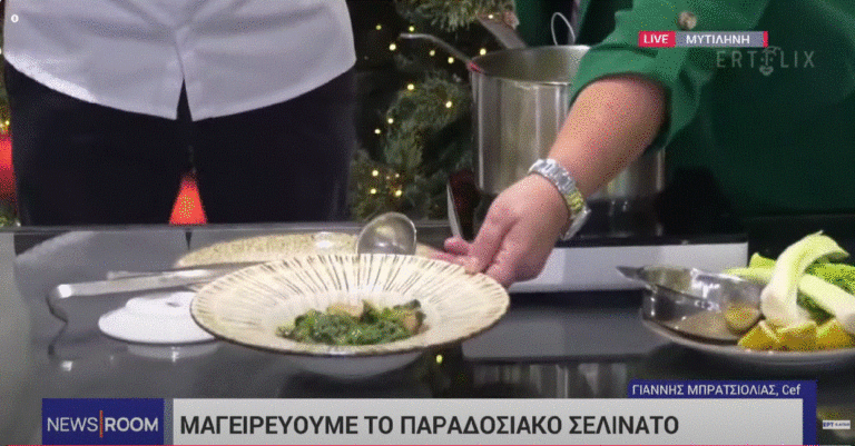Ένα από τα πιο χαρακτηριστικά χριστουγεννιάτικα πιάτα της Λέσβου είναι το σελινάτο, κρέας χοιρινό, μαγειρεμένο μαζί με σέλινο ντόπιο κατά προτίμηση, που είναι πιο μυρωδάτο από το σέλερι που έχει κατακλύσει τα μανάβικα. Ο executive chef κ. Γιάννης Μπρατσολιάς περιέγραψε στην εκπομπή «newsroom”όλα τα στάδια της προετοιμασίας του.