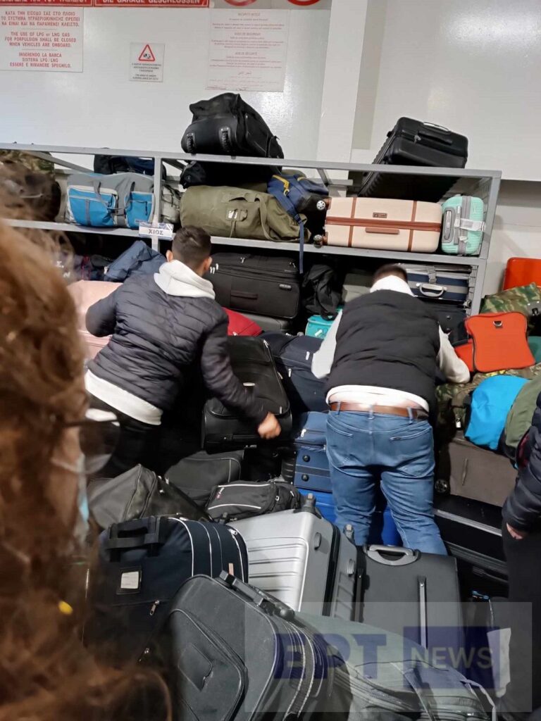 Η ίδια, όπως αναφέρει, είχε τοποθετήσει τις δύο βαλίτσες της σε ραφιέρα του πλοίου στον Πειραιά. Φθάνοντας στη Χίο, το απόγευμα της 8ης Ιανουαρίου και αφού περίμεναν την πρόσδεση του πλοίου, κατεβαίνοντας στο γκαράζ για να πάρει τις βαλίτσες της διαπίστωσε, όπως και οι άλλοι επιβάτες, πως «μπροστά από την ραφιέρα είχε «χτιστεί» ένα ολόκληρο βουνό από βαλίτσες, διπλάσιο σχεδόν σε μέγεθος από την ίδια την ραφιέρα. Κανένα μέλος του πληρώματος δεν βοήθησε στο να μοιραστούν οι αποσκευές. Αυτό που συνέβη ήταν ότι κάποιοι φαντάροι σκαρφάλωσαν στο βουνό από τις βαλίτσες κι έδιναν την αποσκευή σε όποιον μπορούσε να την διακρίνει από μακριά. Όπως φαντάζεστε, για να φτάσω να δω και να πάρω την δικιά μου έπρεπε να μοιραστούν ατάκτως φυσικά όσες ήταν μπροστά, κάτι το οποίο διήρκησε άλλη μισή ώρα».