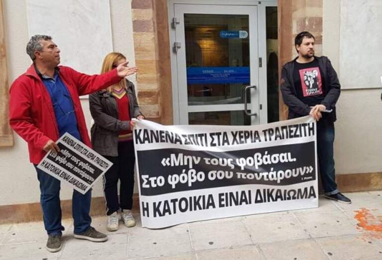 Διαμαρτυρία έξω από τράπεζα στην πόλη της Χίου πραγματοποιεί σήμερα στις 12.30 μ.μ. οικογένεια από το Βροντάδο, που η πρώτη της κατοικία κινδυνεύει με πλειστηριασμό.