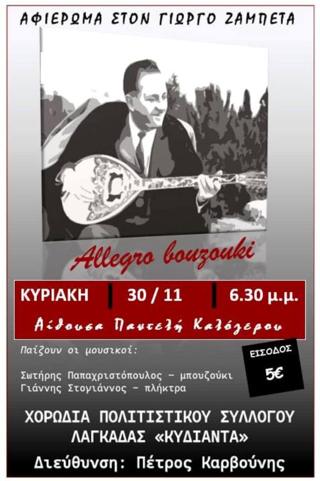 Εκδήλωση αφιερωμένη εξάλλου στο Γιώργο Ζαμπέτα, πραγματοποιεί την Κυριακή 30 Νοεμβρίου ο Πολιτιστικός Σύλλογος Λαγκάδας “Η Κυδιάντα”.