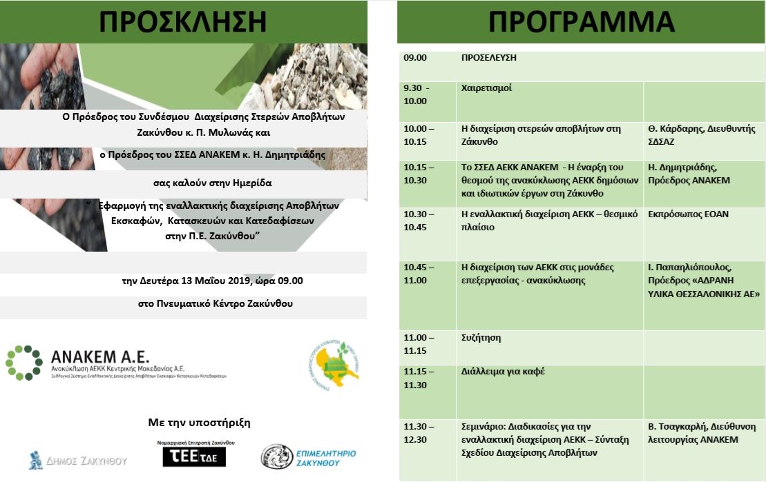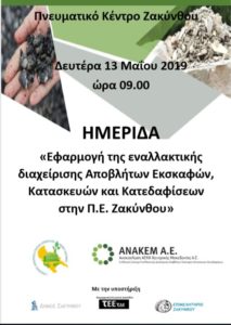 Τη Δευτέρα, 13 Μαΐου 2019 θα πραγματοποιηθεί στο Πνευματικό Κέντρο, Ημερίδα, την οποία συνδιοργανώνουν η ΑΝΑΚΕΜ Α.Ε. και ο Σύνδεσμος Διαχείρισης Στερεών Αποβλήτων Ζακύνθου, με θέμα: «Εφαρμογή της εναλλακτικής διαχείρισης Αποβλήτων Εκσκαφών, Κατασκευών και Κατεδαφίσεων στην Π.Ε. Ζακύνθου».