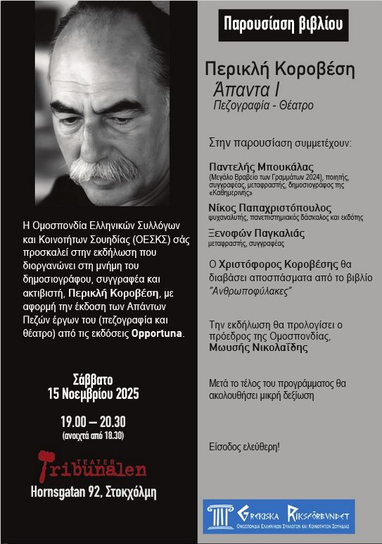 Η Ομοσπονδία Ελληνικών Συλλόγων και Κοινοτήτων Σουηδίας (ΟΕΣΚΣ) διοργανώνει εκδήλωση προς τιμήν του Περικλή Κοροβέση, δημοσιογράφου, συγγραφέα, πολιτικού και αγωνιστή της Δημοκρατίας, το Σάββατο 15 Νοεμβρίου 2025, τοπική ώρα 19:00 στο Θέατρο Tribunalen, Hornsgatan 92, στη Στοκχόλμη.