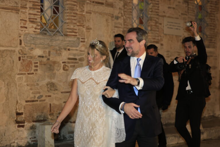 Ήταν πιο εντυπωσιακή από ποτέ και έλαμπε από χαρά. Η νύφη επέλεξε ένα δαντελένιο νυφικό σε ίσια γραμμή κεντημένο με κρύσταλλα, του γνωστού Έλληνα σχεδιαστή Χρήστου Κωσταρέλλου. Τα μαλλιά της ήταν πιασμένα χαλαρά και διακοσμημένα με μια τιάρα από τη συλλογή της τέως βασίλισσας ‘Αννας Μαρίας. Την εμφάνισή της συμπλήρωσε με ένα μακρύ πέπλο με λεπτομέρειες από χειροποίητη δαντέλα. Η νυφική ανθοδέσμη που κρατούσε ήταν από τα αγαπημένα λουλούδια της ‘Αννας Μαρίας, τα μιγκέ.