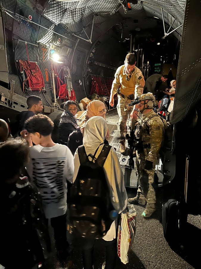 Την Πέμπτη 27 Απριλίου 2023 απογειώθηκε από το Αεροδρόμιο Ασουάν (Aswan) της Αιγύπτου Α/Φ C-130 με προσωπικό Ειδικών Επιχειρήσεων (SOF) της ΔΕΠ του ΓΕΕΘΑ και προορισμό την Αεροπορική Βάση Wadi Seidna βόρεια του Χαρτούμ (Khartoum) στο Σουδάν. Με την προσγείωση του Α/Φ στην Αεροπορική Βάση, το τμήμα SOF προέβη σε έλεγχο και εξασφάλιση της ευρύτερης περιοχής, ενώ παράλληλα συνέδραμε στην διάσωση και επιβίβαση στο Α/Φ 39 πολιτών εκ των οποίων 20 από Ελλάδα, 1 από Γερμανία, 4 από Ισπανία, 5 από Ολλανδία, 1 από Σερβία, 8 από Φιλιππίνες, καθώς και 6 κατοικίδια (σκύλοι). Στην συνέχεια, το Α/Φ απογειώθηκε με προορισμό την Αεροπορική Βάση Ελευσίνας. Την εξέλιξη της επιχείρησης εκκένωσης και διάσωσης παρακολούθησαν και κατεύθυναν ζωντανά από το ΕΘΚΕΠΙΧ ο Υφυπουργός Εθνικής Άμυνας κ. Νικόλαος Χαρδαλιάς και ο Αρχηγός ΓΕΕΘΑ Στρατηγός Κωνσταντίνος Φλώρος.