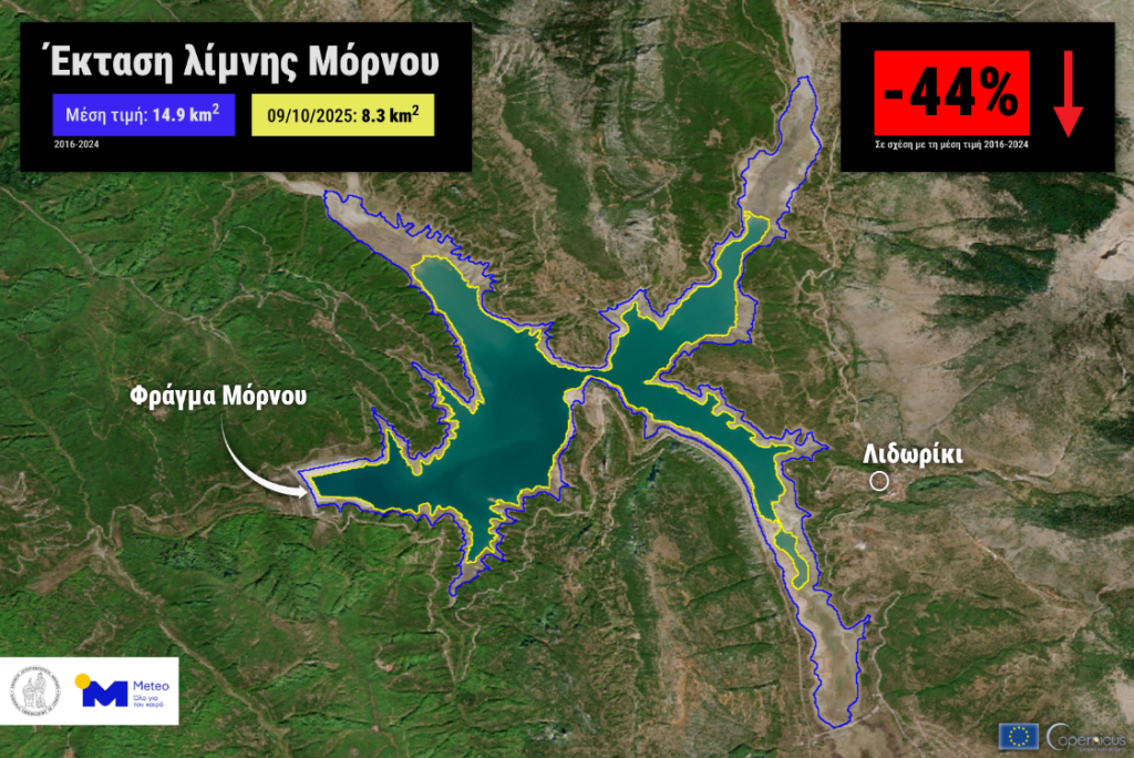 Ο βασικότερος τροφοδότης νερού του λεκανοπεδίου της Αττικής, η λίμνη του Μόρνου, βρίσκεται σε ιστορικό χαμηλό 15ετίας με τις εικόνες που κατέγραψε drone του Οrange Press να είναι αποκαλυπτικές για την οριακή κατάσταση στην οποία βρίσκεται. Σύμφωνα με επίσημα στοιχεία της ΕΥΔΑΠ τα αποθέματα νερού έχουν καταρρεύσει στα 192,8 εκατομμύρια κυβικά μέτρα, τιμή μειωμένη κατά 64% σε σχέση με τον μέσο όρο της περιόδου 2010-2024.