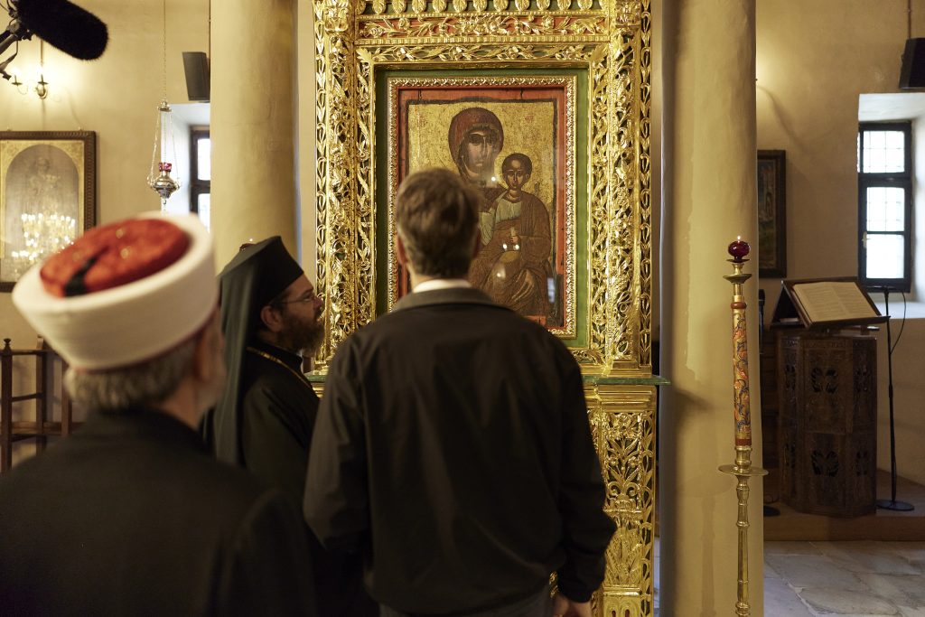 Στο πλαίσιο της επίσκεψής του στην Κομοτηνή, ο Κυριάκος Μητσοτάκης συναντήθηκε με τον Μητροπολίτη Μαρωνείας και Κομοτηνής Παντελεήμων και με τον Τοποτηρητή Μουφτή Κομοτηνής Σερίφ Δαμάδογλου Γιασιάρ, στον Ναό της Κοιμήσεως της Θεοτόκου.
