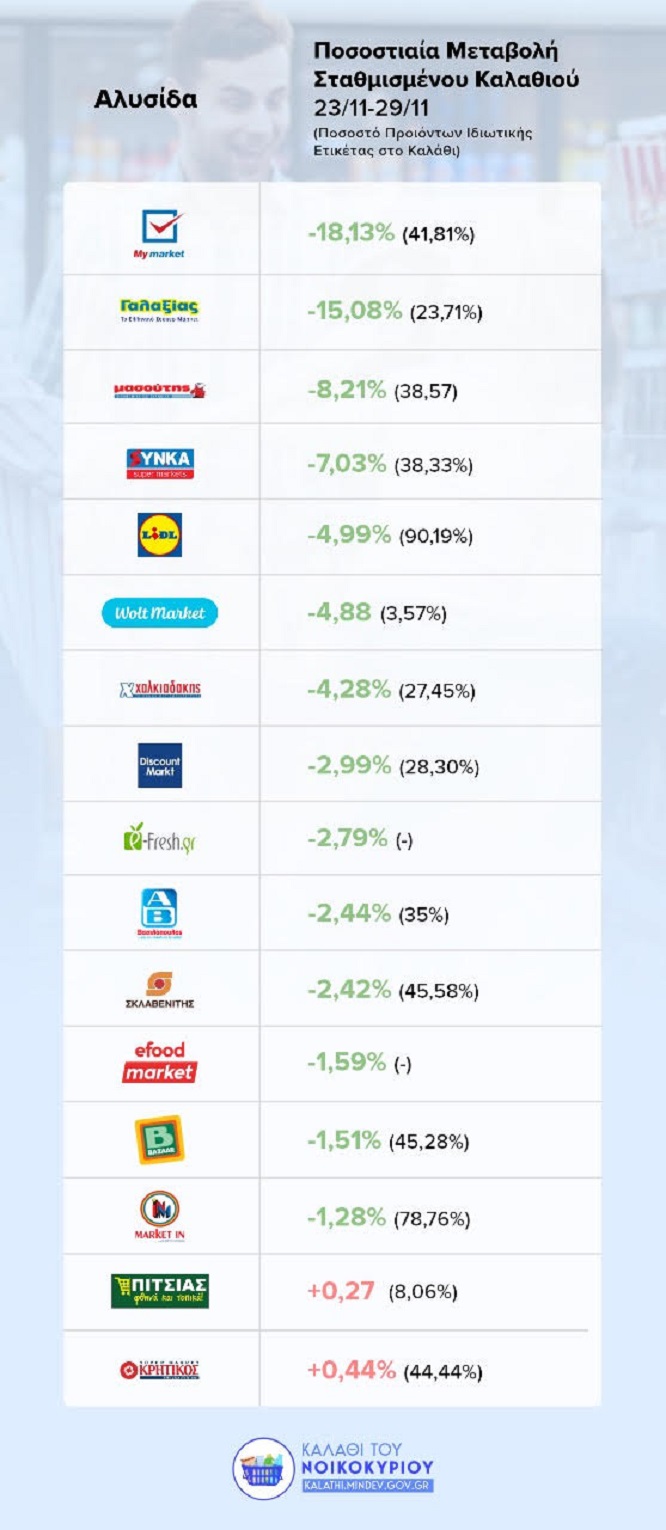 Ως εκ τούτου, το συνολικό κόστος του «καλαθιού του νοικοκυριού» είναι αισθητά μειωμένο στη συντριπτική πλειονότητα των σουπερμάρκετ με τη μεγαλύτερη μείωση -18,1% στην αλυσίδα My market.
