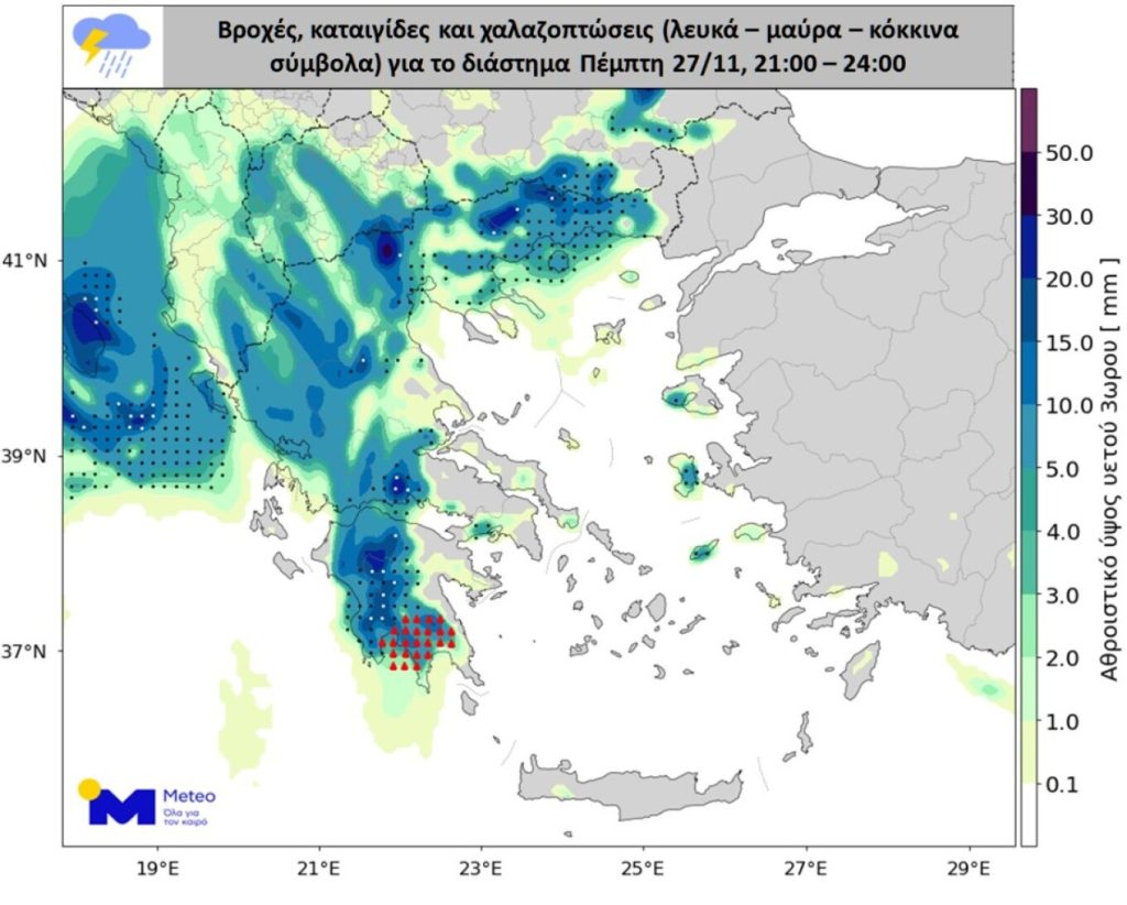 Στους προγνωστικούς χάρτες που ακολουθούν για τα διαστήματα Πέμπτη 27/11, 00:00 – 03:00, Πέμπτη 27/11, 09:00 – 12:00 και Πέμπτη 27/11, 21:00 – 24:00 αποτυπώνονται οι περιοχές όπου θα εκδηλωθούν βροχές ή καταιγίδες και οι περιοχές όπου εντοπίζεται η μεγαλύτερη πιθανότητα εκδήλωσης χαλαζοπτώσεων. Οι μαύρες κουκκίδες απεικονίζουν χαλάζι με μεγέθη έως 2 εκατοστά, τα κόκκινα τρίγωνα απεικονίζουν χαλάζι με μεγέθη μεγαλύτερα των 2 εκατοστών, ενώ οι λευκές κουκκίδες δείχνουν πού αναμένονται μεγάλες ποσότητες χαλαζιού.
