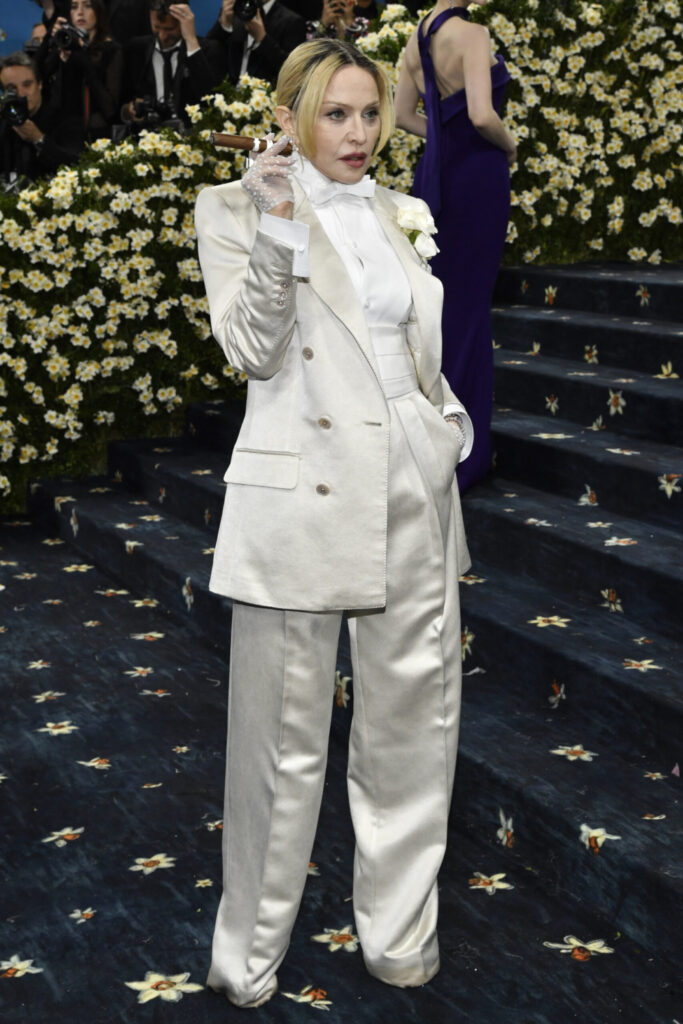Ο θρύλος της ποπ Μαντόνα συνδύασε το κρεμ σμόκιν της με ένα πούρο, δημιουργώντας ένα παιχνίδι ανάμεσα σε απαλά θηλυκά υλικά και μια ξεχωριστή αρσενική ενέργεια.