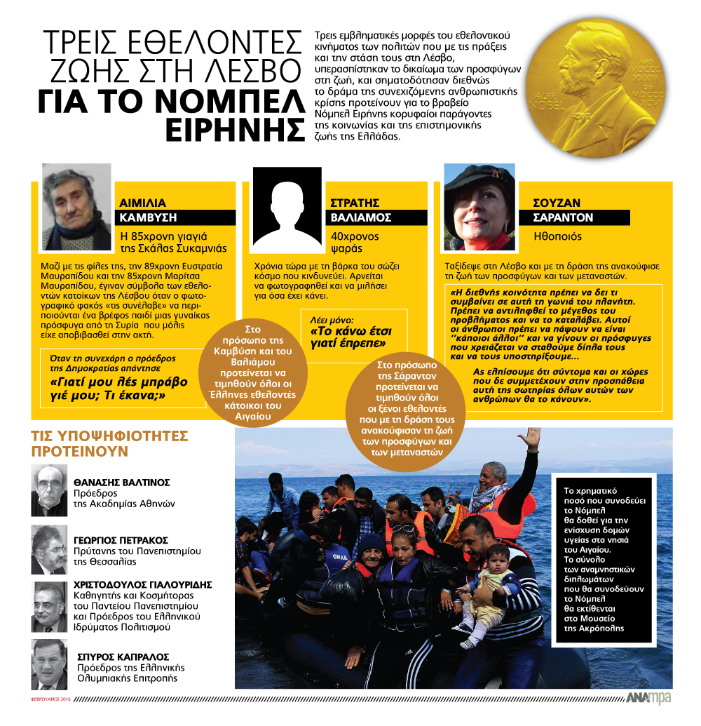 Δύο κάτοικοι της Λέσβου, η 85χρονη Αιμιλία Καμβύση, η οποία απαθανατίστηκε την ώρα που τάιζε με μπιμπερό ένα βρέφος από τη Συρία καθώς και ο Στρατής Βαλαμιός, ο 40χρονος ψαράς ο οποίος καθημερινά έβγαζε από τη θάλασσα ανθρώπους, αποτελούν την πρόταση για Νόμπελ, ως εκπρόσωποι όλων των Ελλήνων εθελοντών.